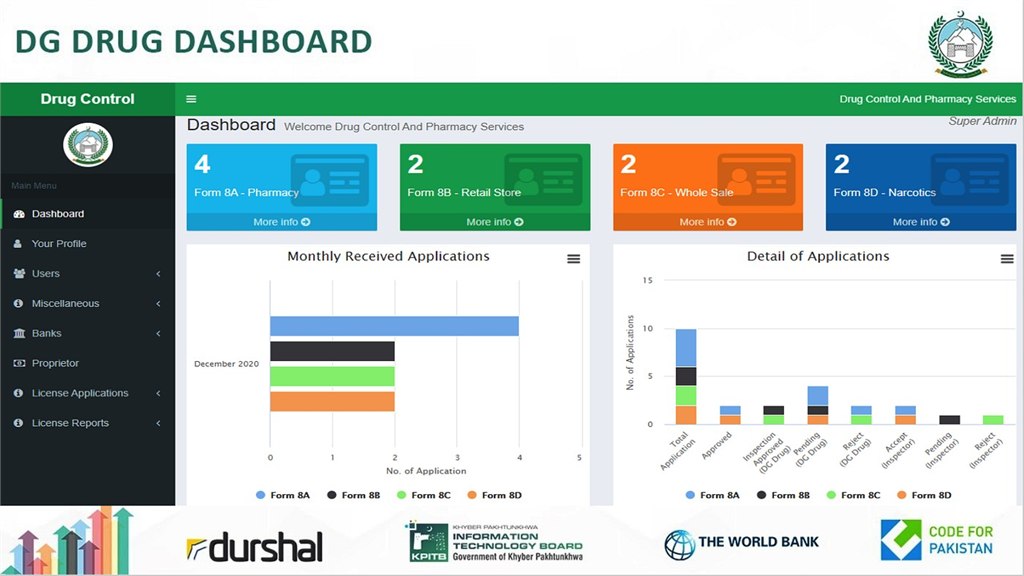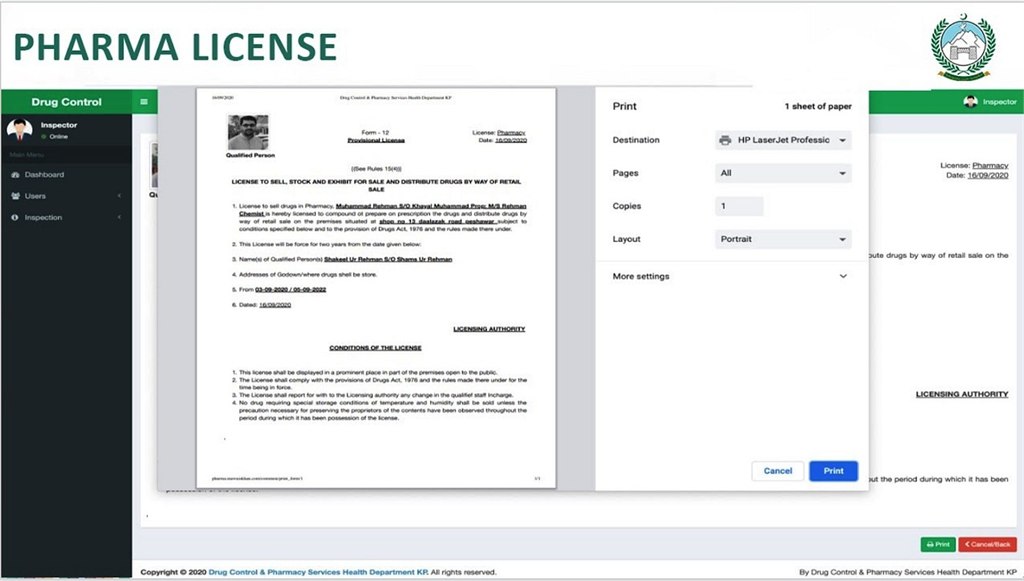 Deployed in December 2020, the system will transform and streamline the department’s record keeping processes, improving oversight for detecting discrepancies and other shortcomings in license issuing processes. Since the process will be shifted online, it will reduce the time it takes to issue new licenses, verify existing licenses and renew licenses. It will enable performance tracking of inspectors, with built-in performance tracking mechanisms. The system’s most significant impact will be bringing transparency in the pharmaceutical sector and ensuring that only registered pharmacies are allowed to operate in the province with improved oversight and control of the Health Department.